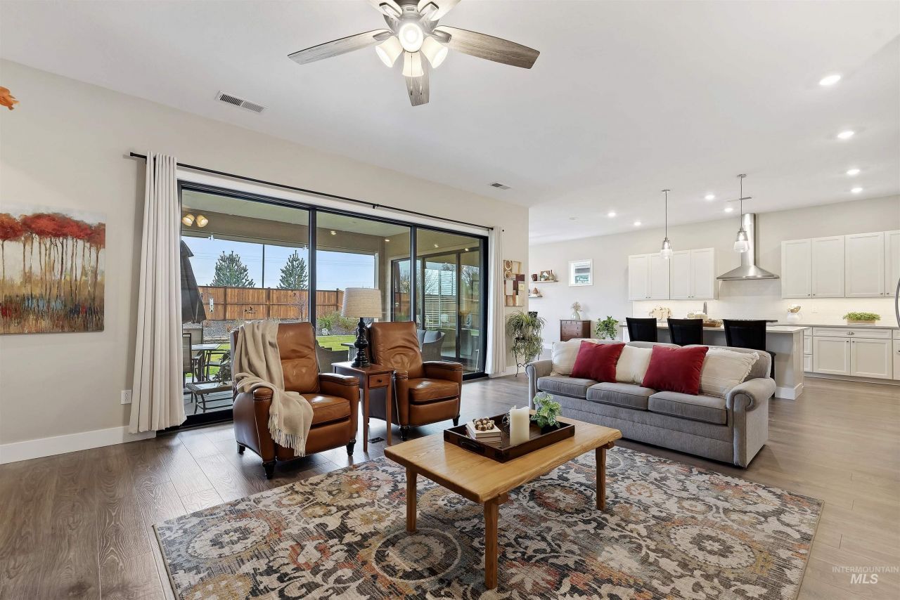 Welcome to the Trilogy Valor 55+ resort-style gated community! With over $235,000 in upgrades & custom features this better than new estate is far superior to its competition. Two triple slider doors spanning the length of both the great room and dining room open to an outdoor living space complete with a covered patio and picturesque view of the beautifully landscaped backyard and garden. The ADA roll-in shower, custom tile and double 180 degree swinging glass doors and other ADA home attributes allow you to spend your days in elegance and ease giving you more time to enjoy the amenities! The stone gas fireplace, live edge walnut mantel and gorgeous LVP flooring welcome you while the chefs kitchen boasts an expansive center island with farmhouse sink, extra tall soft-close cabinets with pull out drawers, gas range, built-in oven and under cabinet lighting. Enjoy the split bedroom floor plan, large primary suite, and designated guest suite with a private bath and WIC for visitors. This smart home highlights a Ring doorbell, Alexa Echo, and Wifi booster. Take advantage of the Social Club amenities including the fitness center, full restaurant and bar, pickleball courts, 3 pools, and many walking paths. The adjacent Falcon Crest Golf course is one of the Treasure Valleys premier golf experiences making this package complete for your Forever Home!