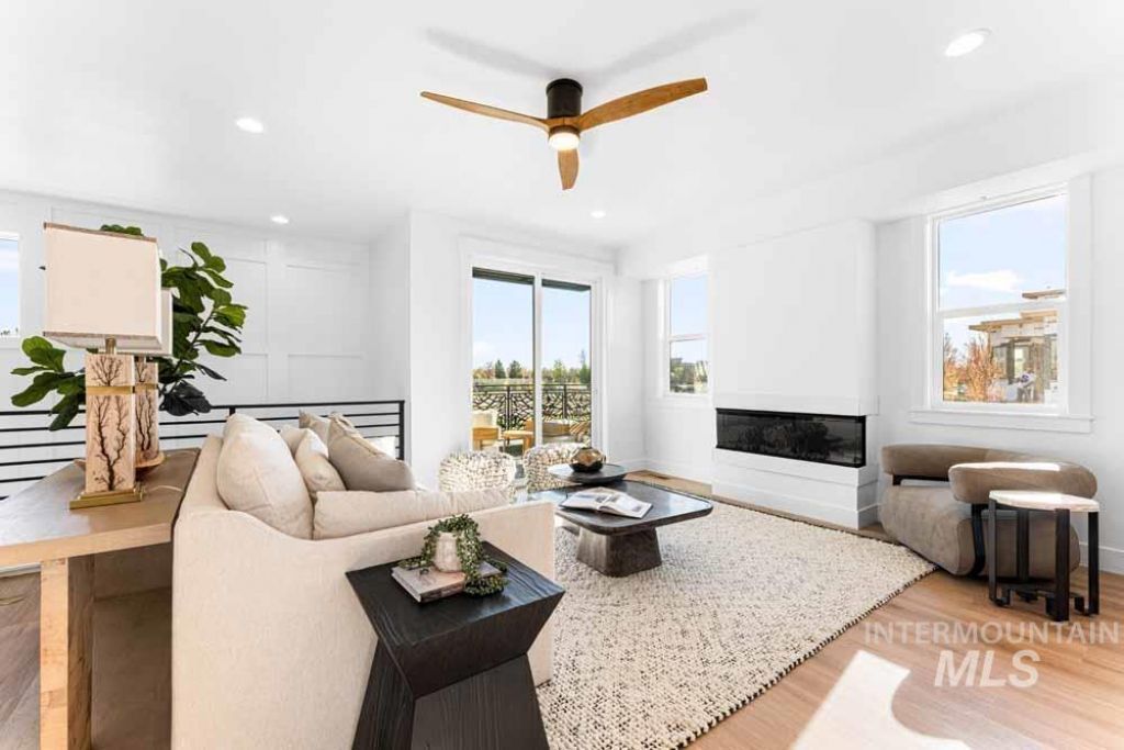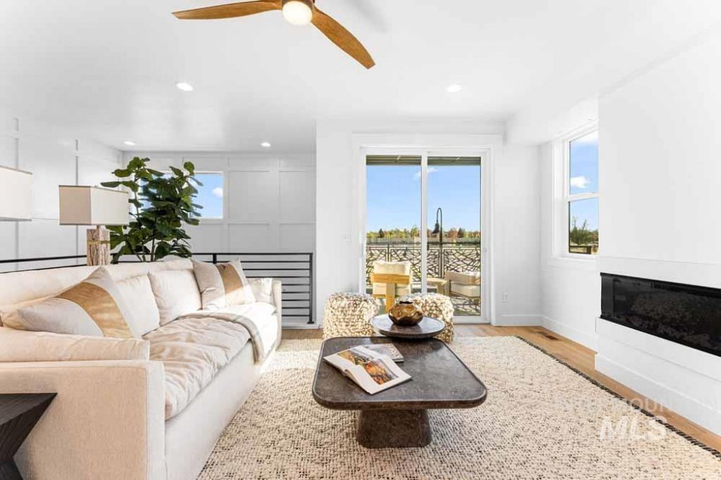 Presenting the signature model home of Molinari Park, showcasing the most elevated finishes in the community and setting the benchmark for luxury living in downtown Eagle. This thoughtfully designed residence features wide plank wood flooring, upscale wall treatments, 8-foot doors, 9-foot ceilings, and a designer lighting package throughout. The expansive open-concept second level is flooded with natural light from oversized windows and offers seamless indoor-outdoor living with two private balconies. The designer kitchen makes a bold statement with dual waterfall quartz islands, ceiling-height frameless cabinetry, and the communitys most upgraded stainless steel appliance package. Open living and dining spaces are anchored by a sleek modern fireplace, while a striking custom accent wall welcomes you from the ground level. The ground level includes a private bedroom with exterior entrance, en suite bath, and walk-in closet, ideal for guests, a home office, or flexible living space. Upstairs, three additional bedrooms include a luxurious primary suite featuring exposed wood beams, a custom accent wall, and a spa-inspired bath with a massive frameless glass walk-in tiled shower and dual-sink vanity. Community amenities include a dog park and curated landscaping, all within walking distance of Eagles best attractions.