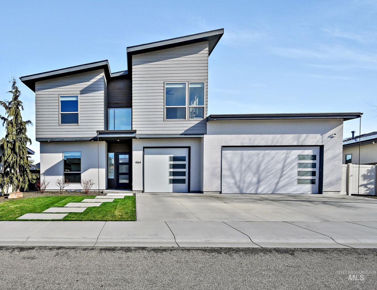 Striking architectural design defines this refined modern luxury home in Movado Estates, one of Meridians most desirable communities. The stunning main-level primary suite offers a private retreat featuring a spa-inspired bath with a freestanding soaking tub, walk-in shower, dual vanities, and a spacious walk-in closet. An adjoining laundry room adds everyday convenience. A second bedroom or office and full bath on the main level provide exceptional flexibility for guests or remote work. Designed for both daily living and entertaining, the chef-inspired kitchen showcases a large quartz island, premium cabinetry, high-end appliances, and a butlers pantry. The open-concept great room features soaring 18-foot ceilings, expansive windows that flood the home with natural light, and a dramatic feature-wall gas fireplace. Enjoy seamless indoor-outdoor living with an expansive covered patio overlooking Five Mile Creek and captivating mountain views?perfect for relaxing or hosting gatherings. The upper level offers a spacious second great room, two additional bedrooms, a full bath, and versatile multi-use spaces?an ideal retreat for the younger generation or extended living. Additional highlights include abundant storage throughout, an oversized three-car garage, and the exciting potential for a future rooftop balcony to take full advantage of the surrounding views.