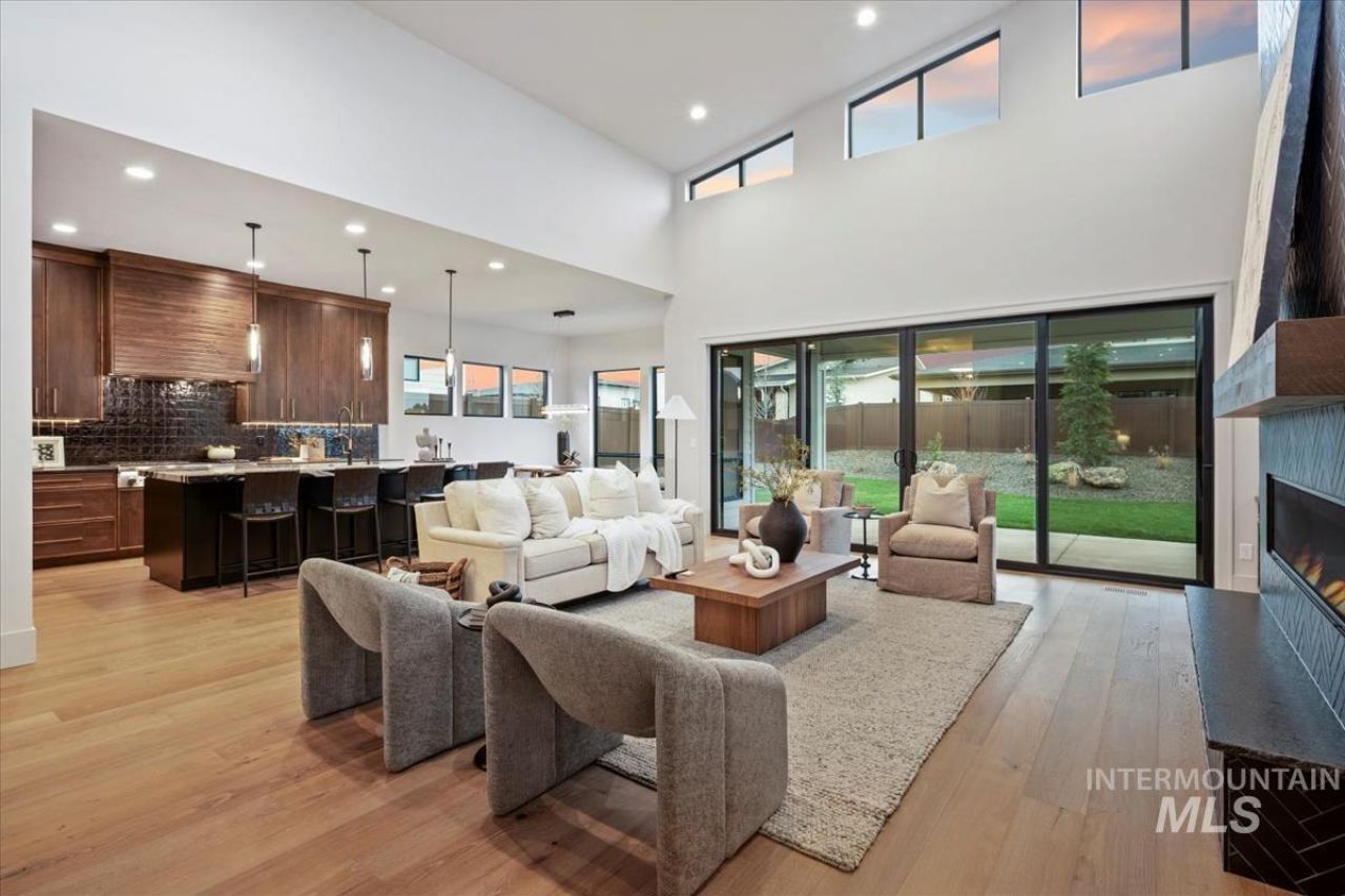Discover the height of Mountain Modern luxury in Stars exclusive Torchlight Estates. This custom single-level masterpiece by KD Kolnes Construction blends organic textures with sleek architectural lines, anchored by a stunning great room with soaring vaulted ceilings and a floor-to-ceiling tile fireplace. The chefs kitchen is a true showstopper, featuring a massive marble statement island, professional Thermador range and Bosch speed oven combo, all complemented by a built-in wine bar with marble surfaces. Designed for ultimate privacy, the layout includes a dedicated executive office and three spacious bedrooms?each featuring its own private ensuite with premium quartz countertops. The spa-like master suite offers a serene escape, while high-end mechanicals like dual 50-gallon water heaters with recirculation and central vac plumbing ensure effortless living. With its perfect blend of rugged elegance and sophisticated custom detail, this home redefines upscale Idaho living.
